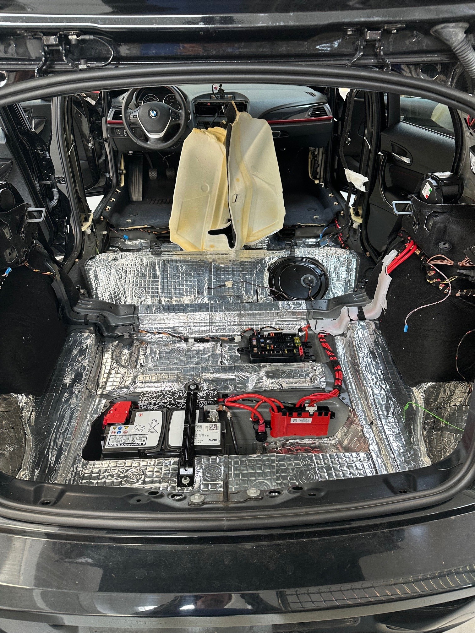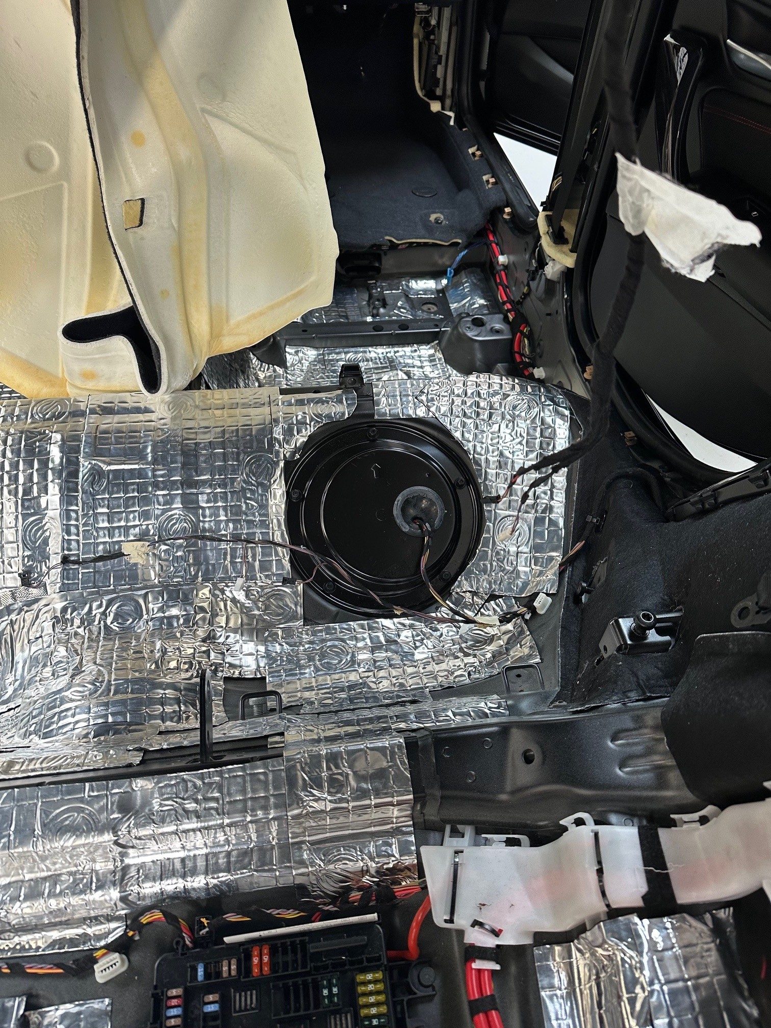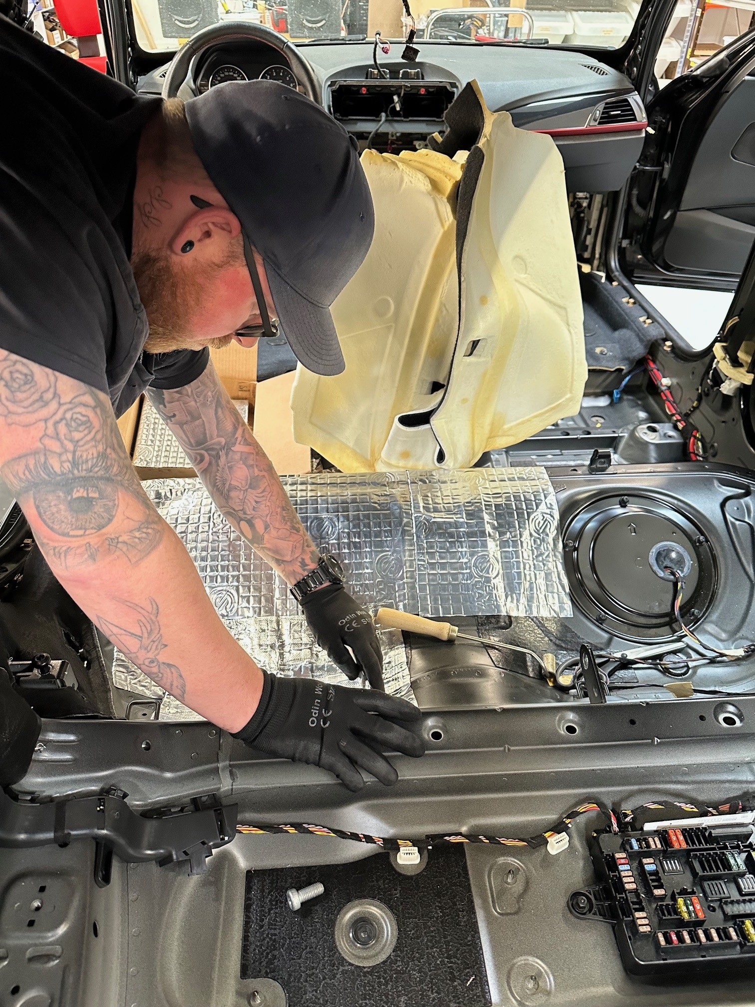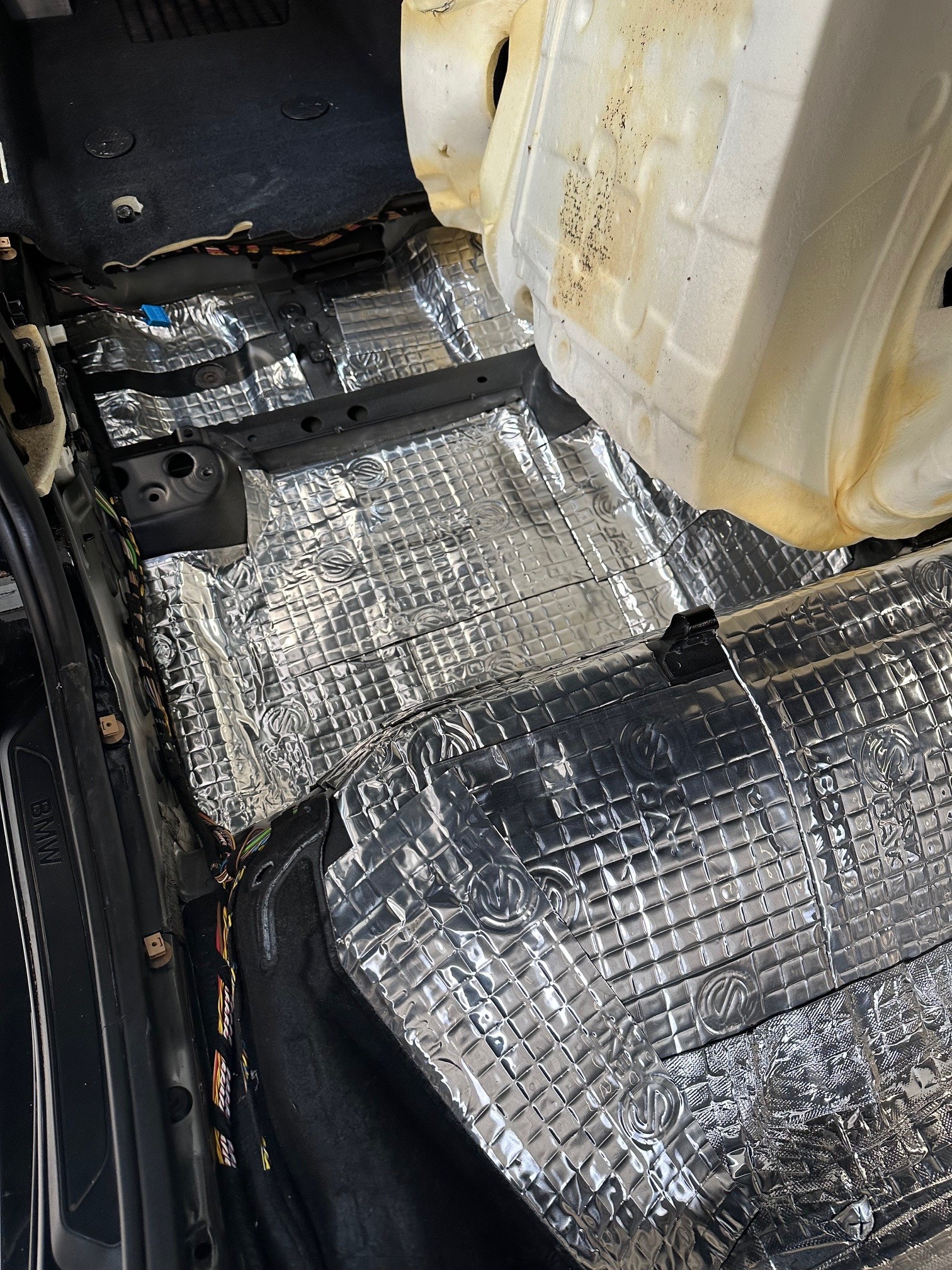 Så kom turen til bunden, som også beklædes udførligt med Silent Coat vibrodamp 1,8 mm. Silent Coat Vibrodamp reducerer panelresonans og absorberer strukturelle vibrationer og omdanner dem til lavniveauvarme. Materialet stopper irriterende raslelyde, eliminer vej- og udendørsstøj og skaber en markant forbedring af lyden i bilen.