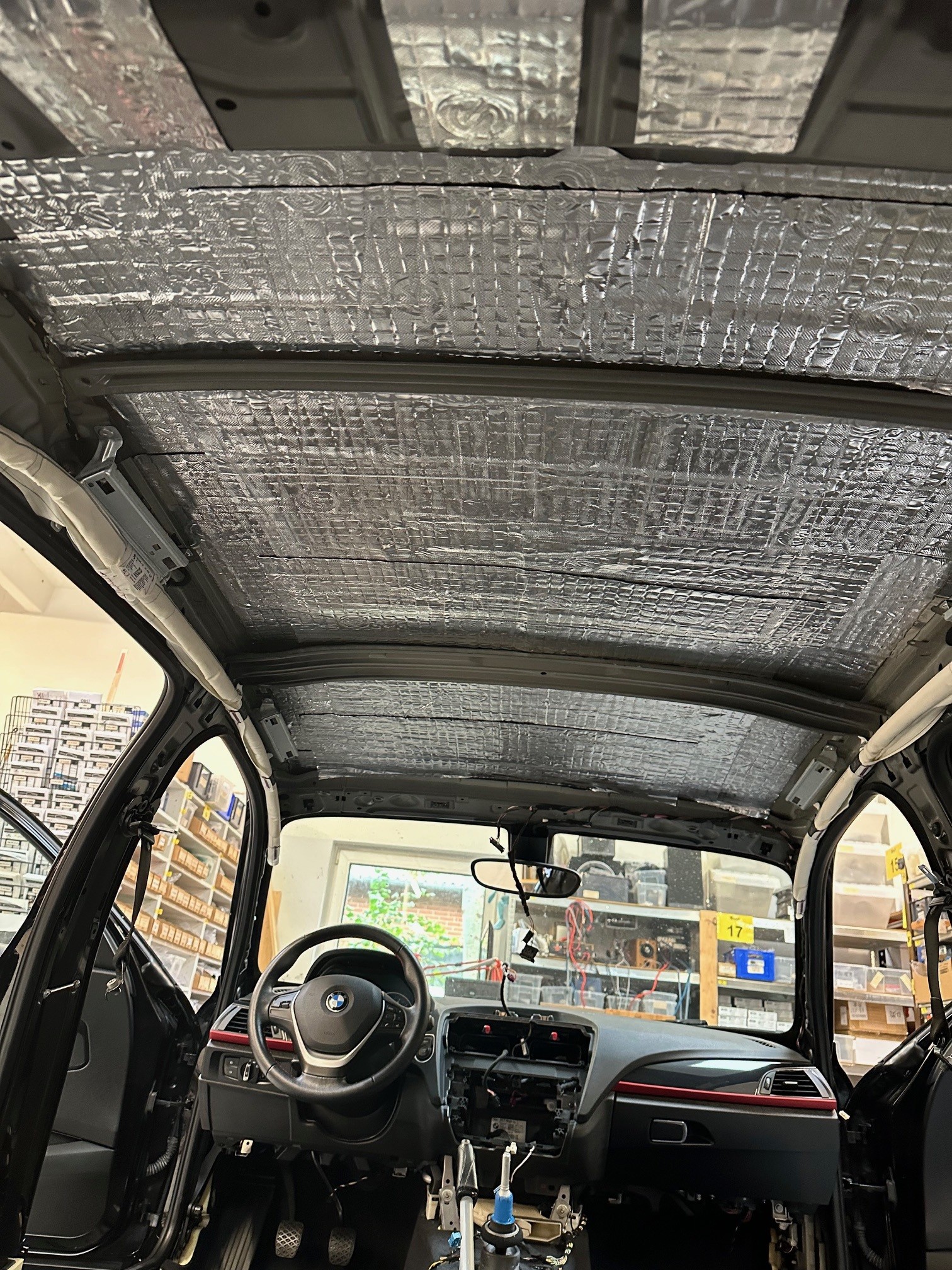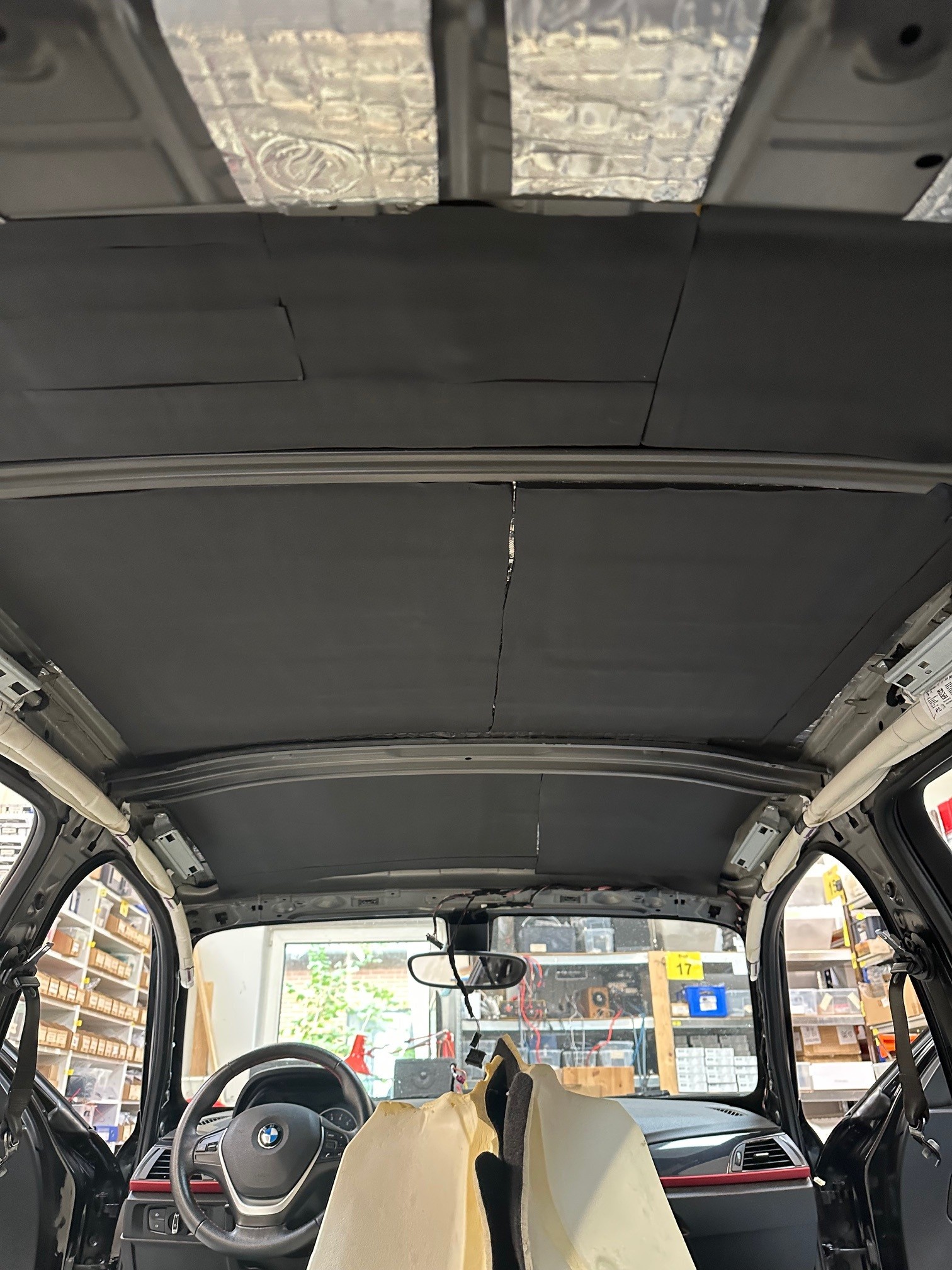 Støjdæmpning af taget. Først beklædes taget med Silent Coat vibrodamp 1,8 mm for at dæmpe vibrationer og resonans. Herefter lægges en 6 mm Silent Coat noise isolator, der effektivt reducerer støj og isolerer mod varme og kulde. Sammen får vi en effektiv 2-lagsløsning, der optimalt både absorberer og reducerer luftbåren støj.