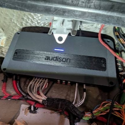 Kraftfuld og alsidig Audison SR6.600 6-kanals forstærker monteret og fint gemt af vejen i fodbrønden under handskerummet i passagersiden.👍