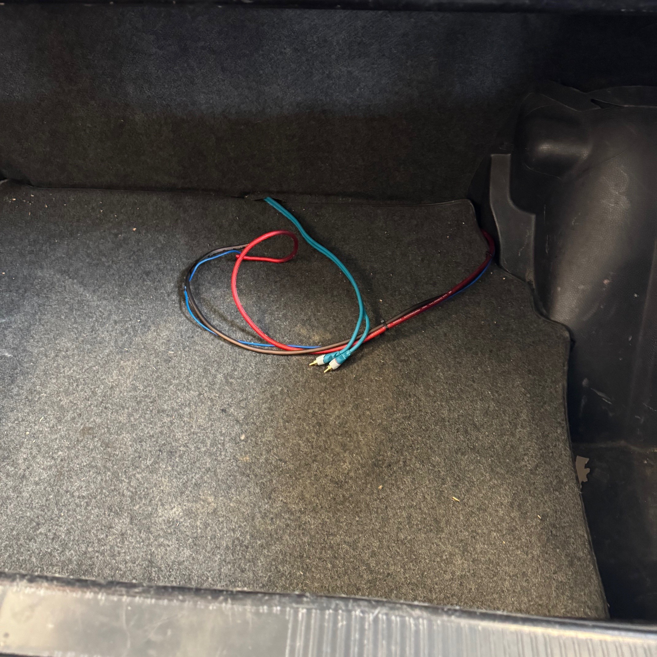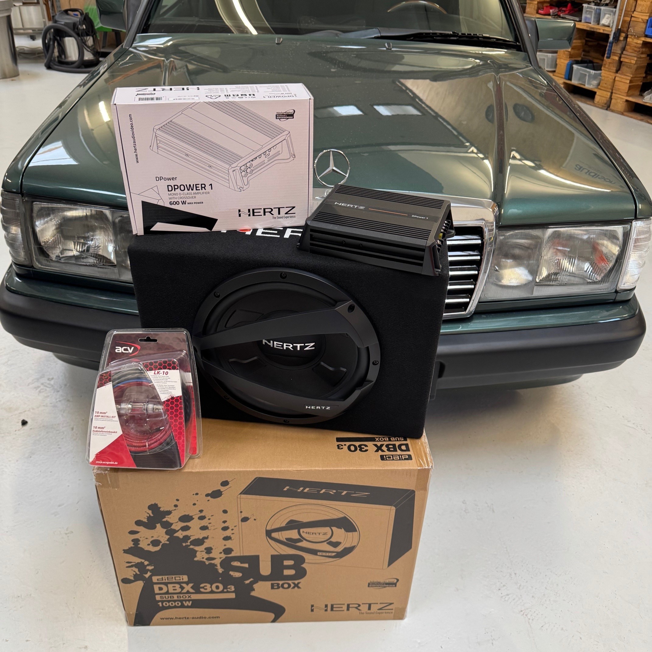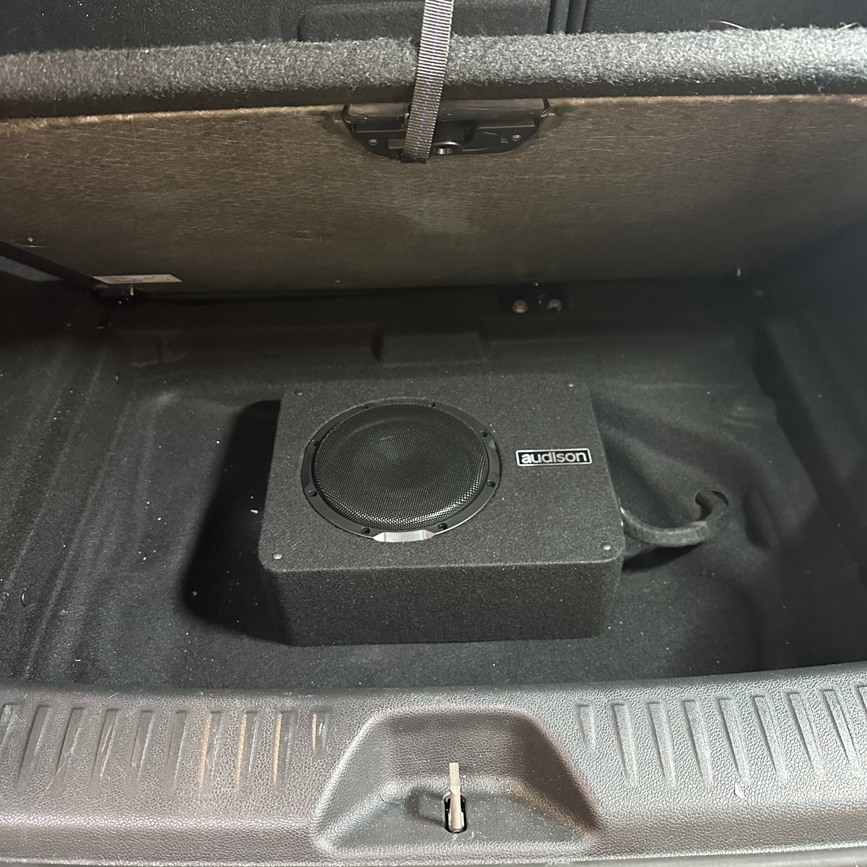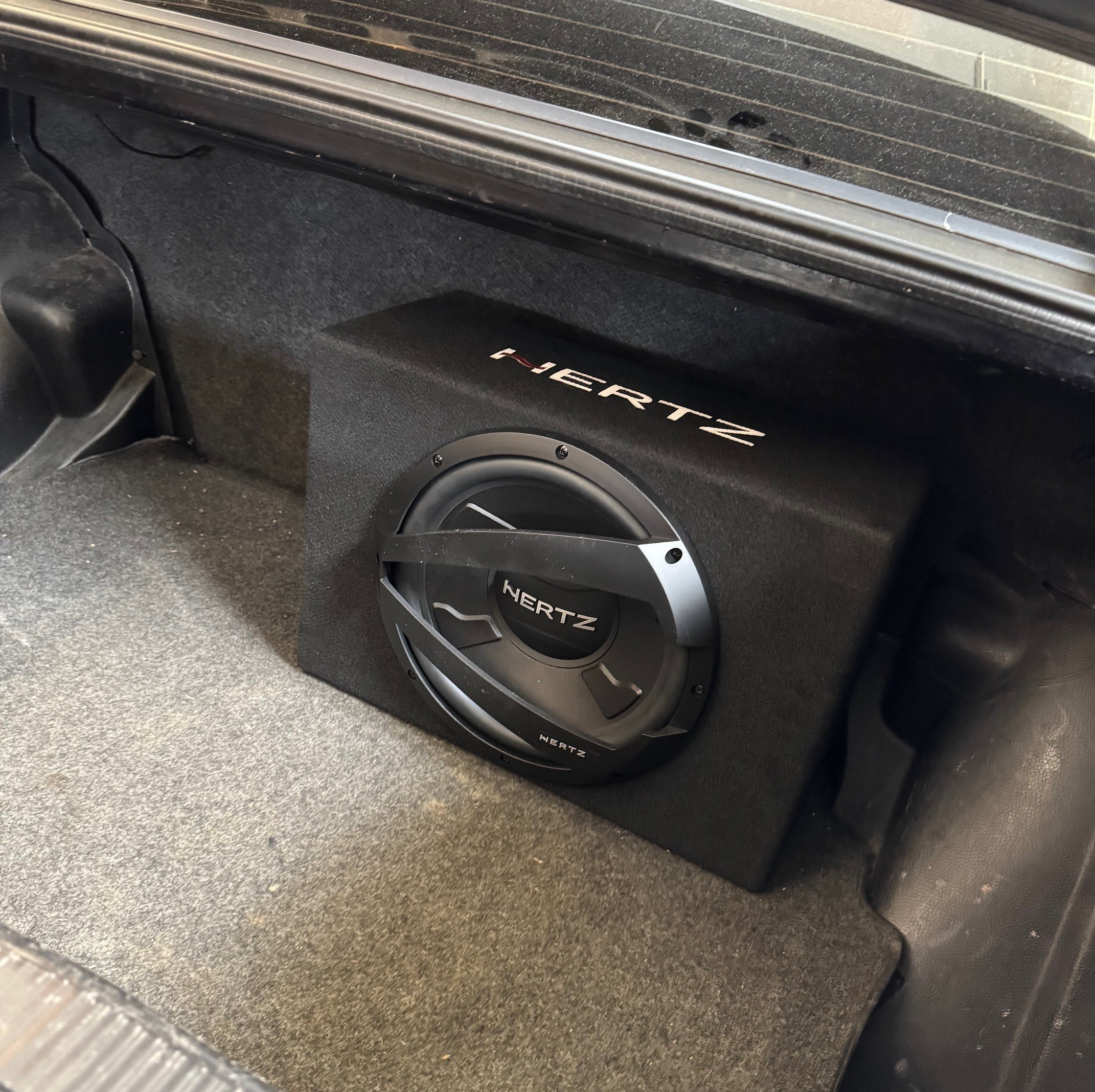 Her er subwooferen monteret stående i bagagerummet, mens forstærkeren er elegant skjult bagved.