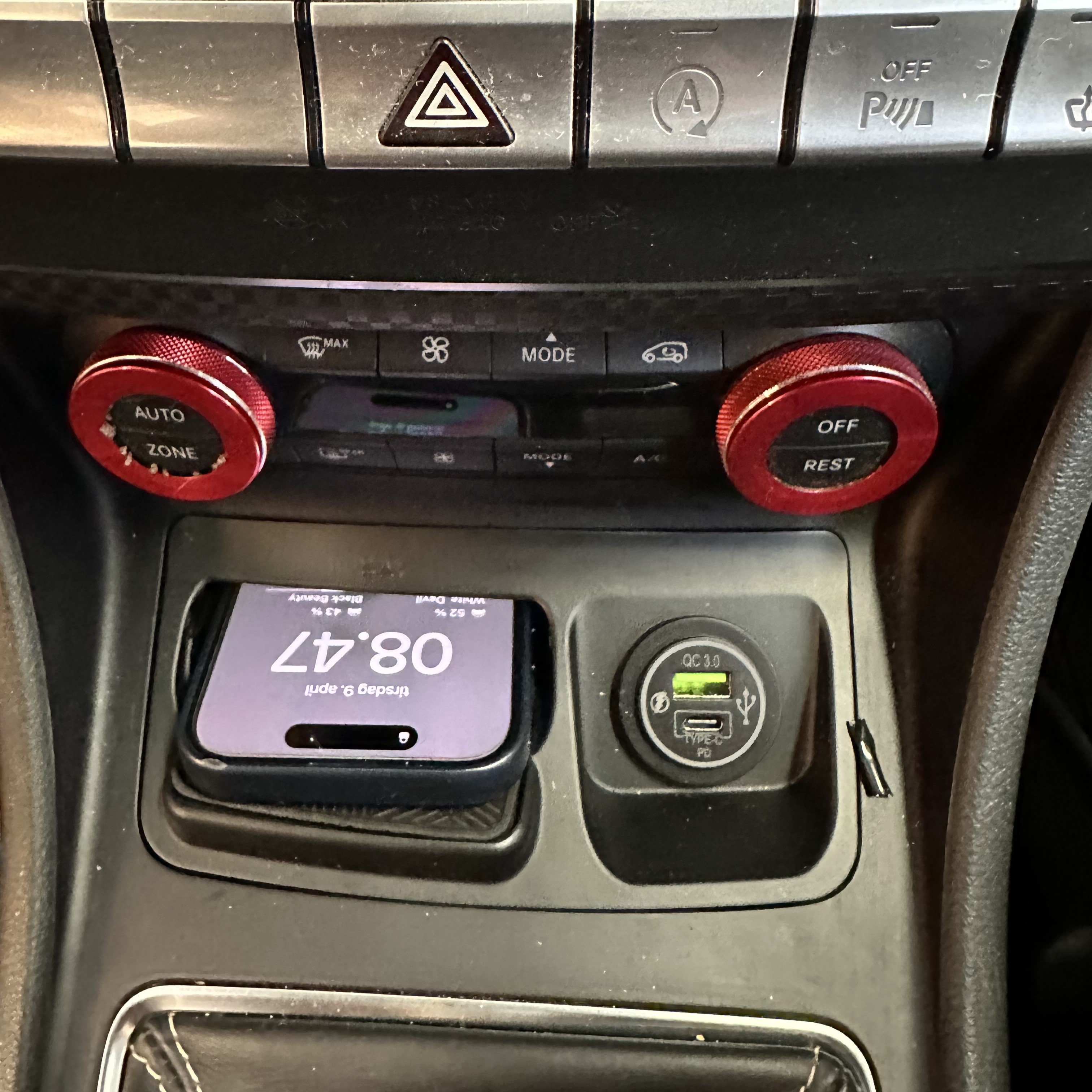 Montering af Audison subwoofer og modelintegreret trådløs Qi telefonoplader.