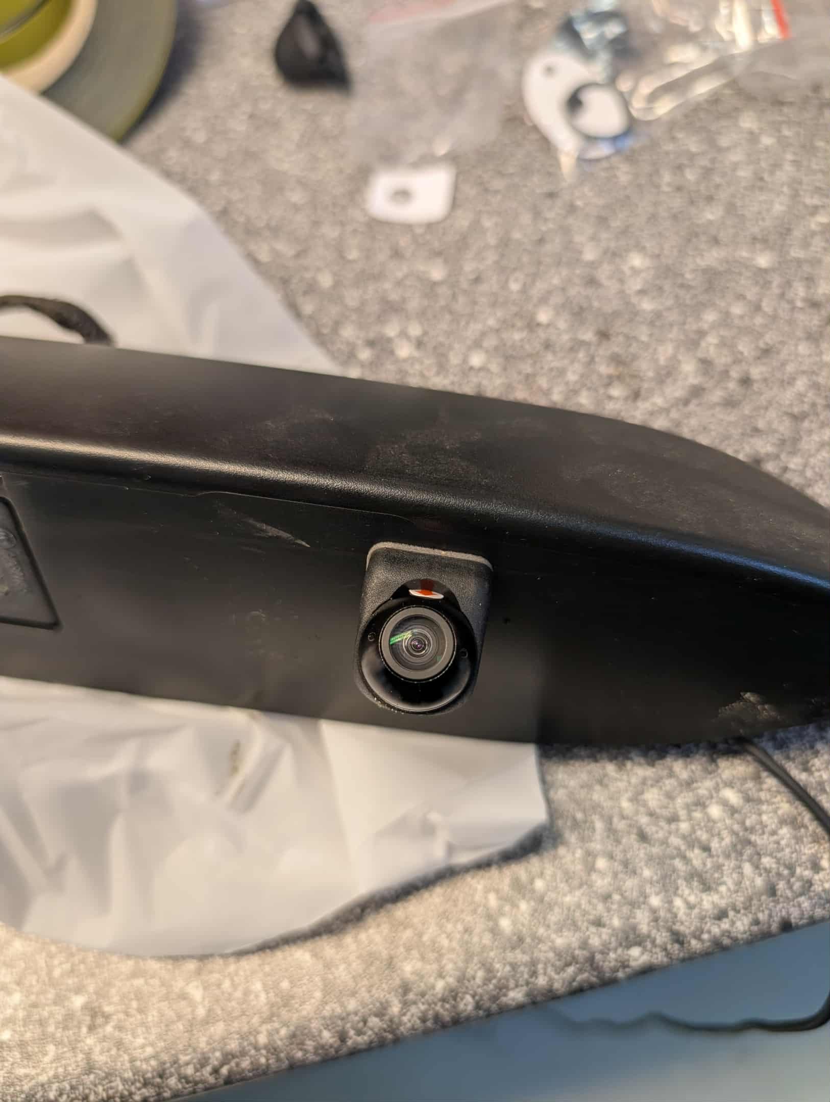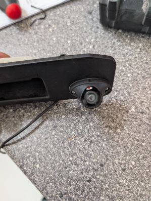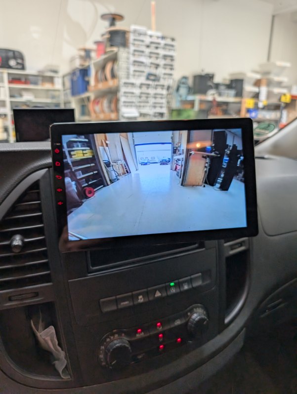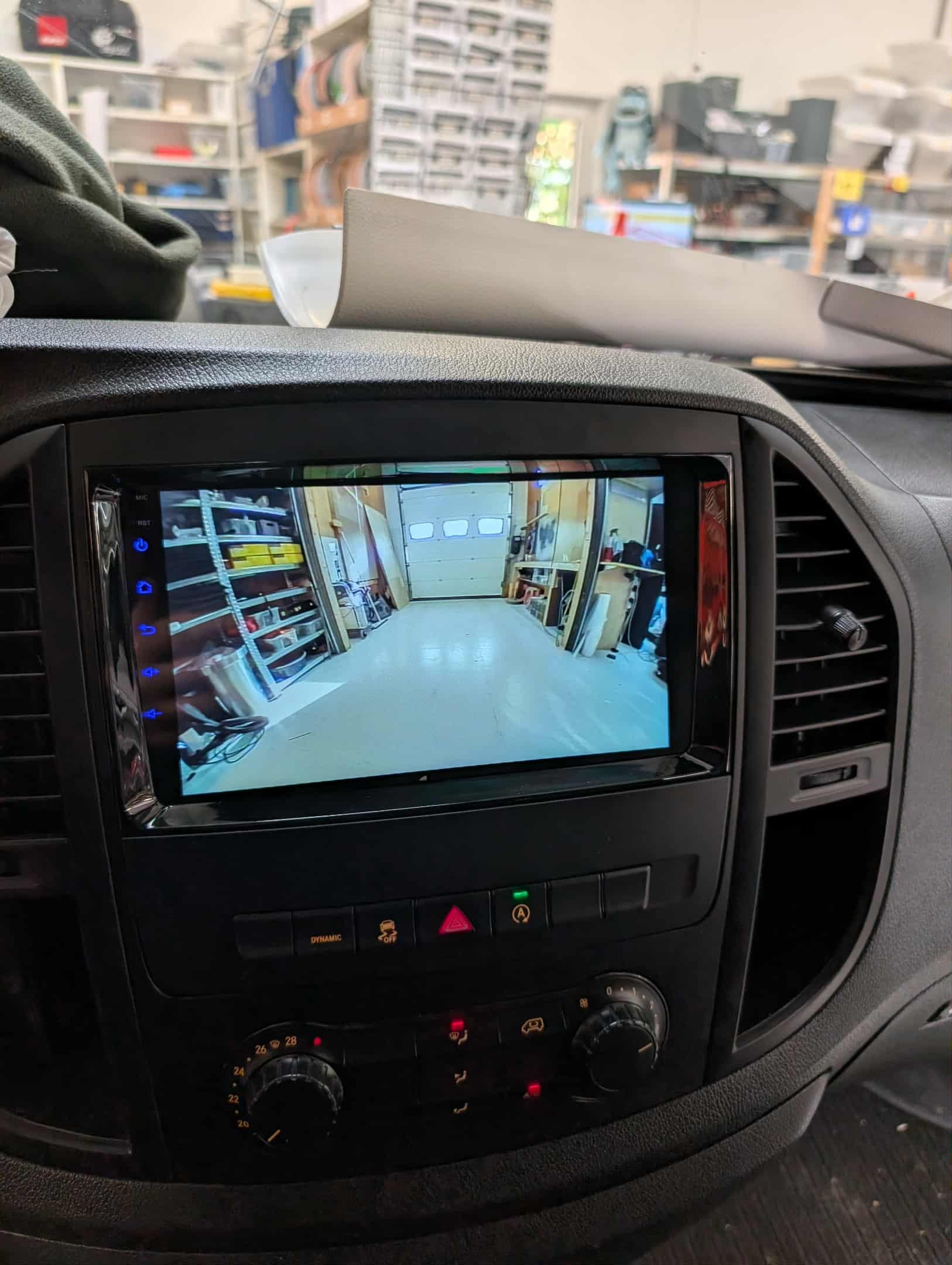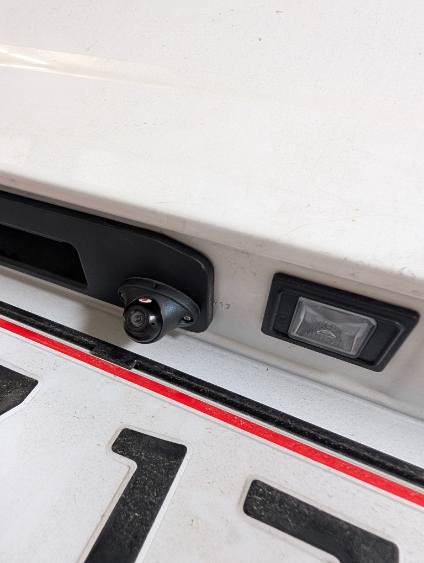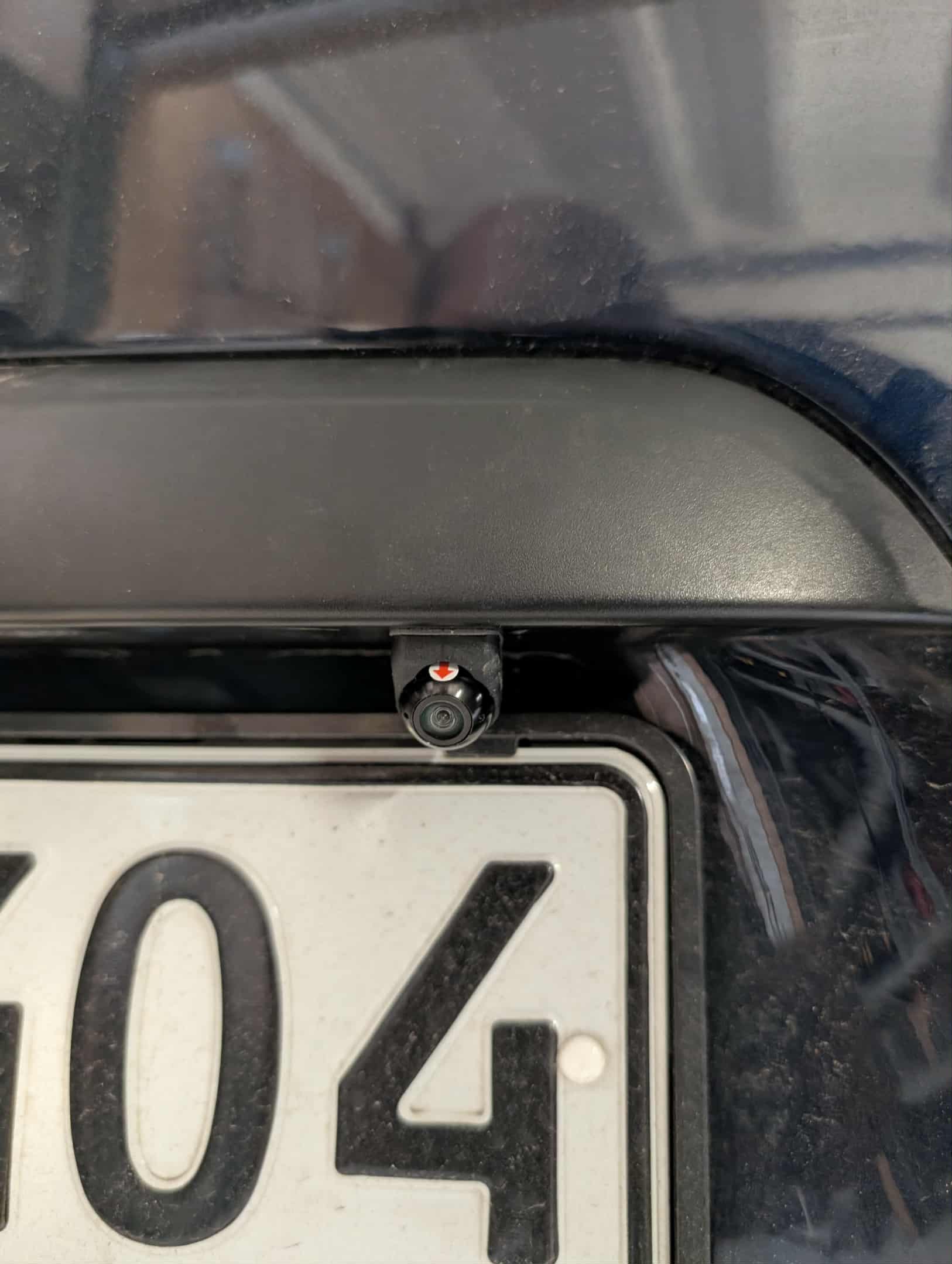 1-DIN radio med svæveskærm samt bakkamera monteret på bagklap-håndtaget.